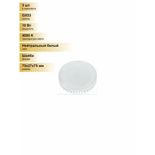 (3 шт.) Светодиодная лампочка LEEK GX53 св/д 10W(850lm) 4000K 4K 75x27 матов. LE010508-0024 Нейтральный белый. Цоколь GX53