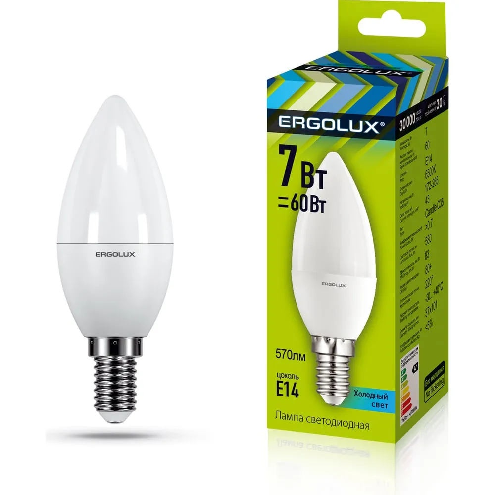 Электрическая светодиодная лампа Ergolux LED-C35-7W-E14-6K Свеча 12874