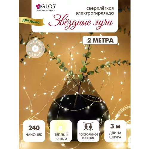 Электрогирлянда GLOS Хвост Звездные лучи GLR2009/GLR2008, 2 м, 240 ламп теплый светодиоды 240 шт. теплый белый/прозрачный провод