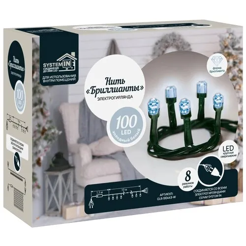 Электрогирлянда GLOS Нить Бриллианты GLR-SI0442 / GLR-SI0443, 10 х 0.03 м, 100 ламп 1 холодный светодиоды 3 см 100 шт. холодный белый/черный провод