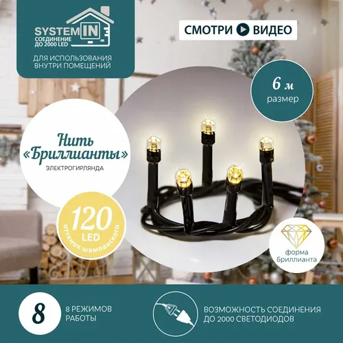 Электрогирлянда GLOS Нить Бриллианты GLR-SI0442 / GLR-SI0443, 6 м, 120 ламп теплый светодиоды 120 шт. теплый белый/черный провод