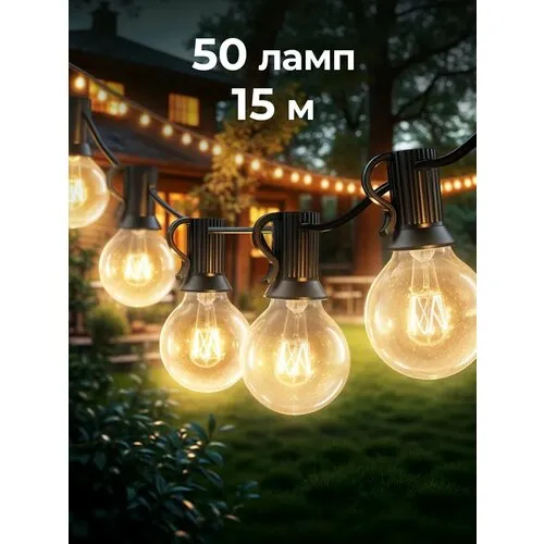 3Гирлянда уличная Classmark 15 метров, 50 лампочек, питание от сети 220В, новогодняя, ретро, 2 шт
