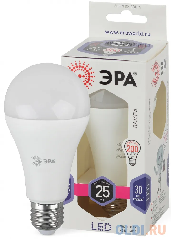 Упаковка ламп LED Эра E27, груша, 25Вт, 2700К, белый теплый, A65-25W-827-E27, 3 шт. [б0035334]