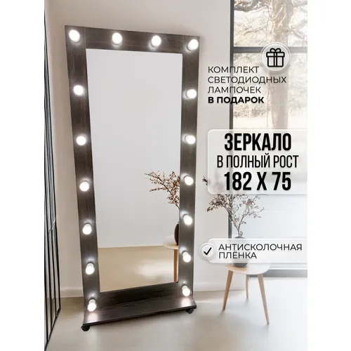 Гримерное зеркало BeautyUp 182/75 с лампочками на подставке с колесиками, Цвет "Венге"