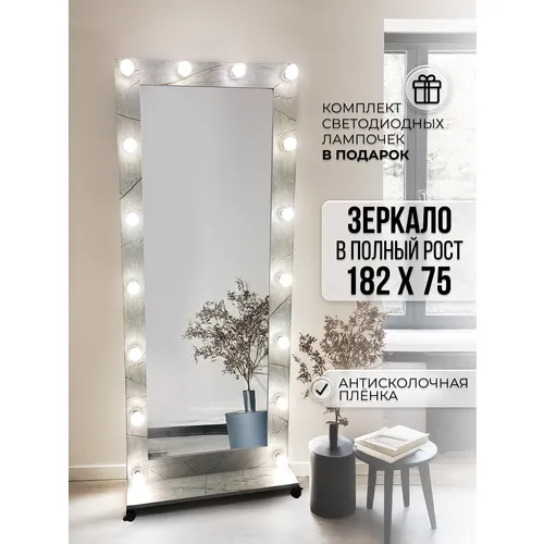 Гримерное зеркало BeautyUp 182/75 с лампочками на подставке с колесиками, Цвет "Герион"