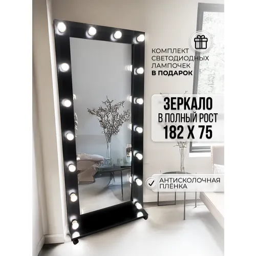 Гримерное зеркало BeautyUp 182/75 с лампочками на подставке с колесиками, Цвет "Черный"