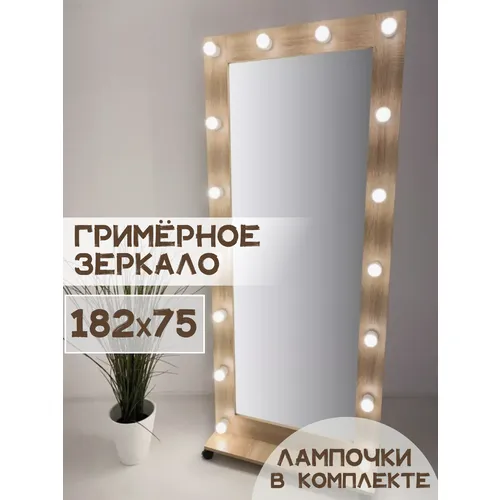 Гримерное зеркало BeautyUp 182/75 с лампочками на подставке с колесиками, Цвет "Сосна рустик"