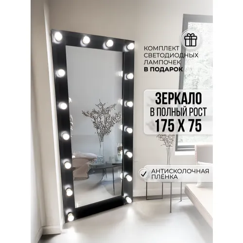 Гримерное зеркало BeautyUp 182/75 с лампочками на подставке с колесиками, Цвет "Черный"