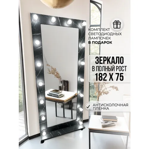 Гримерное зеркало BeautyUp 182/75 с лампочками на подставке с колесиками, Цвет "Черный"