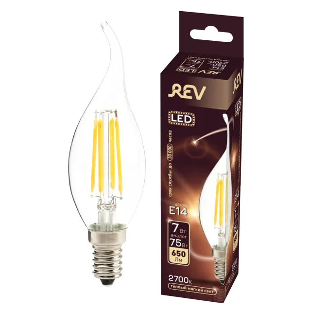 лампа филаментная REV 7Вт E14 560лм 2700K 220В свеча на ветру CA37