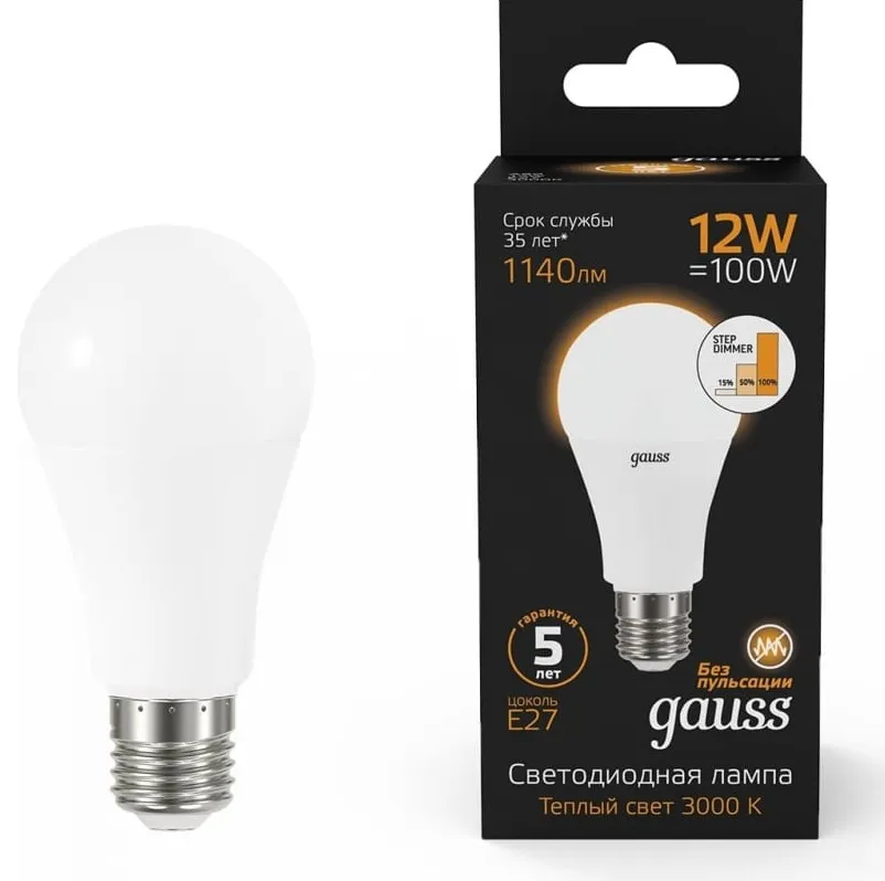 Лампа Gauss A60 12W 1140lm 3000 K Е27 шаг. диммирование LED