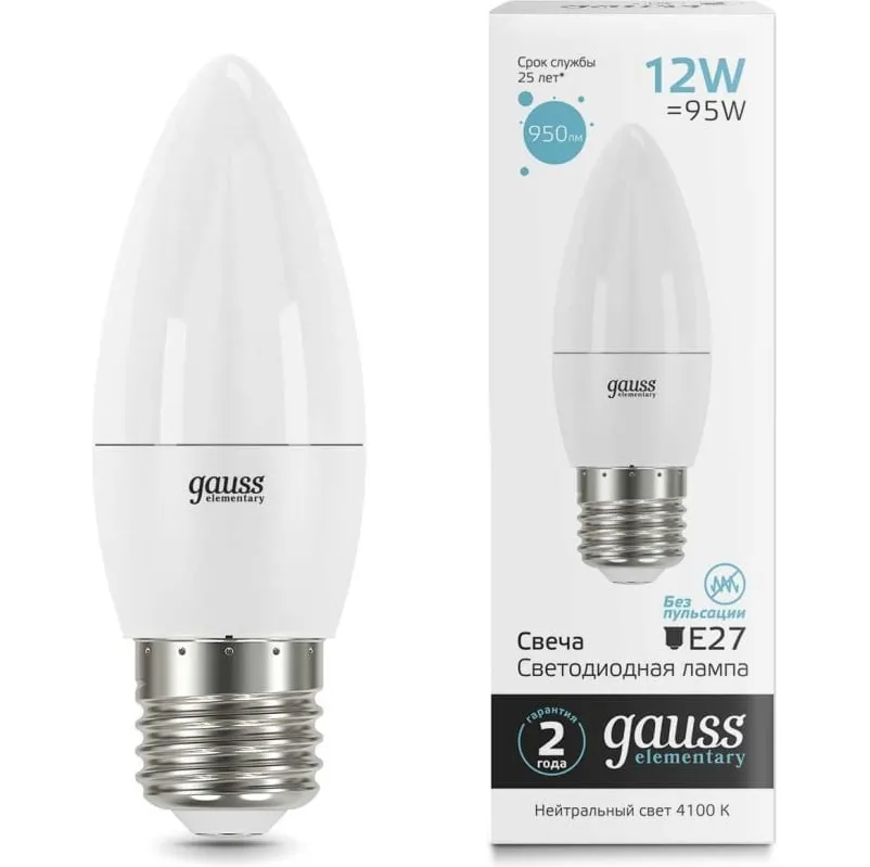 Лампа светодиодная Gauss Elementary 30222 12Вт цок.:E27 свеча 220B 4100K св.свеч.бел.нейт. (упак.:10шт)