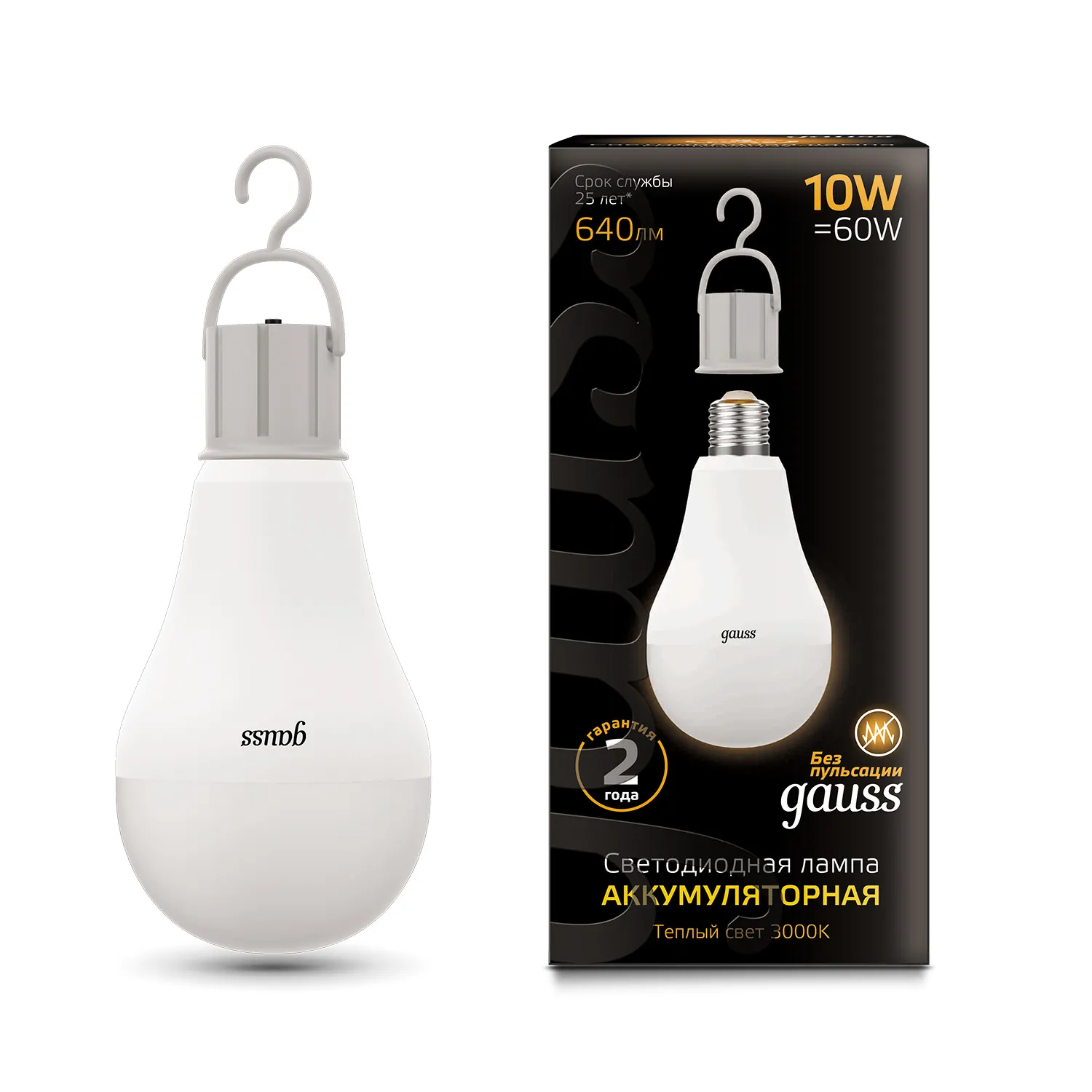 Лампа Gauss LED A60 10W E27 640lm 3000K с Li-Ion аккумулятором 1/10/60