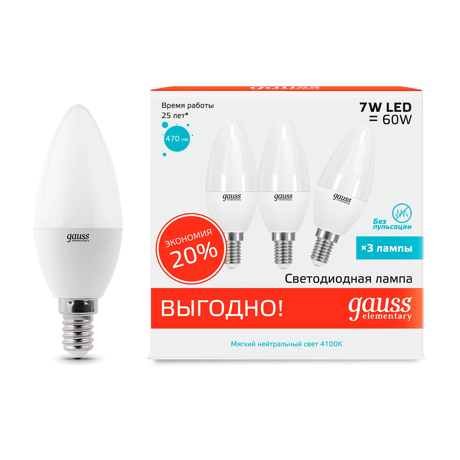 Лампа Gauss LED Elementary Свеча 7W E14 4100K 1/40 (3 лампы в упаковке)