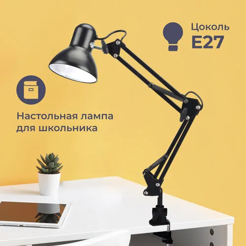 Лампа настольная Homsly с цоколем Е27, крепление струбцина, цвет корпуса глянцевый черный, TTL_004