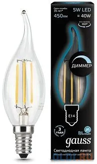 Лампа светодиодная филаментная Gauss Е14 4100К 5 Вт 450 Лм 175-240 В свеча прозрачная диммируемая