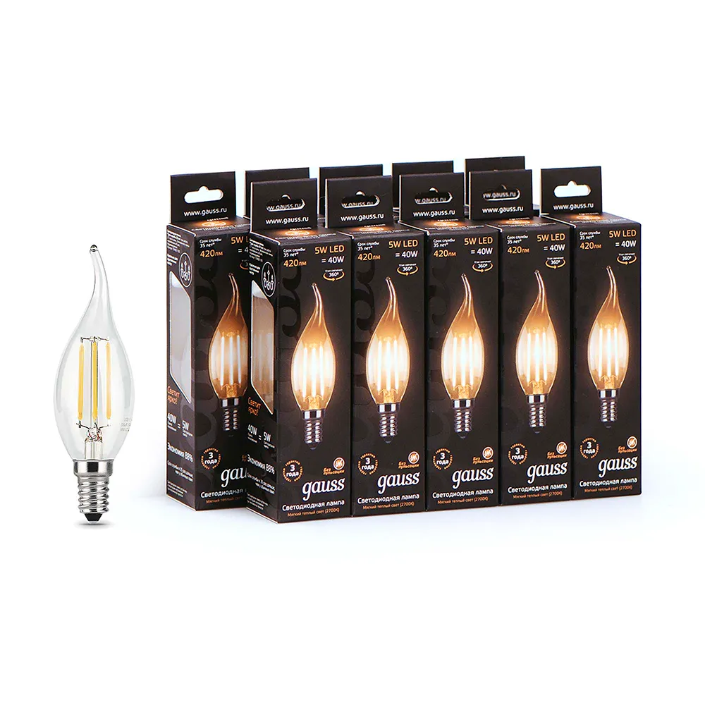Лампа светодиодная филаментная Gauss Е14 2700К 5 Вт 420 Лм 150-265 В свеча на ветру прозрачная (10 шт.)
