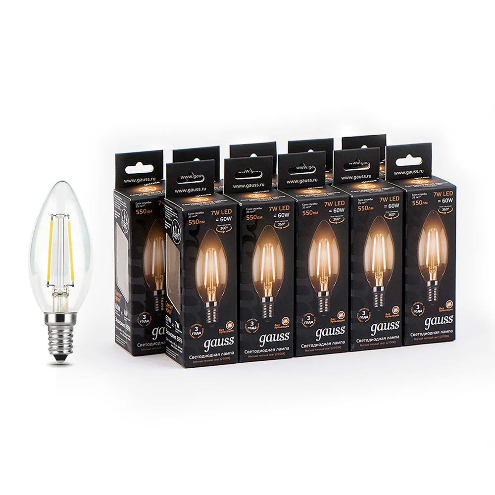 Лампа светодиодная филаментная Gauss Е14 2700К 7 Вт 150-265 В свеча прозрачная (10 шт.)