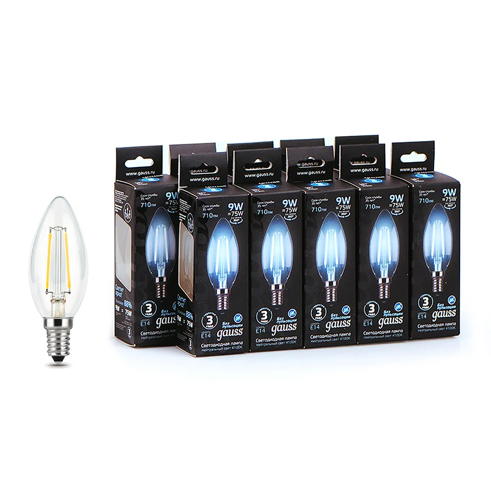 Лампа светодиодная филаментная Gauss Е14 4100К 9 Вт 150-265 В свеча прозрачная (10 шт.)
