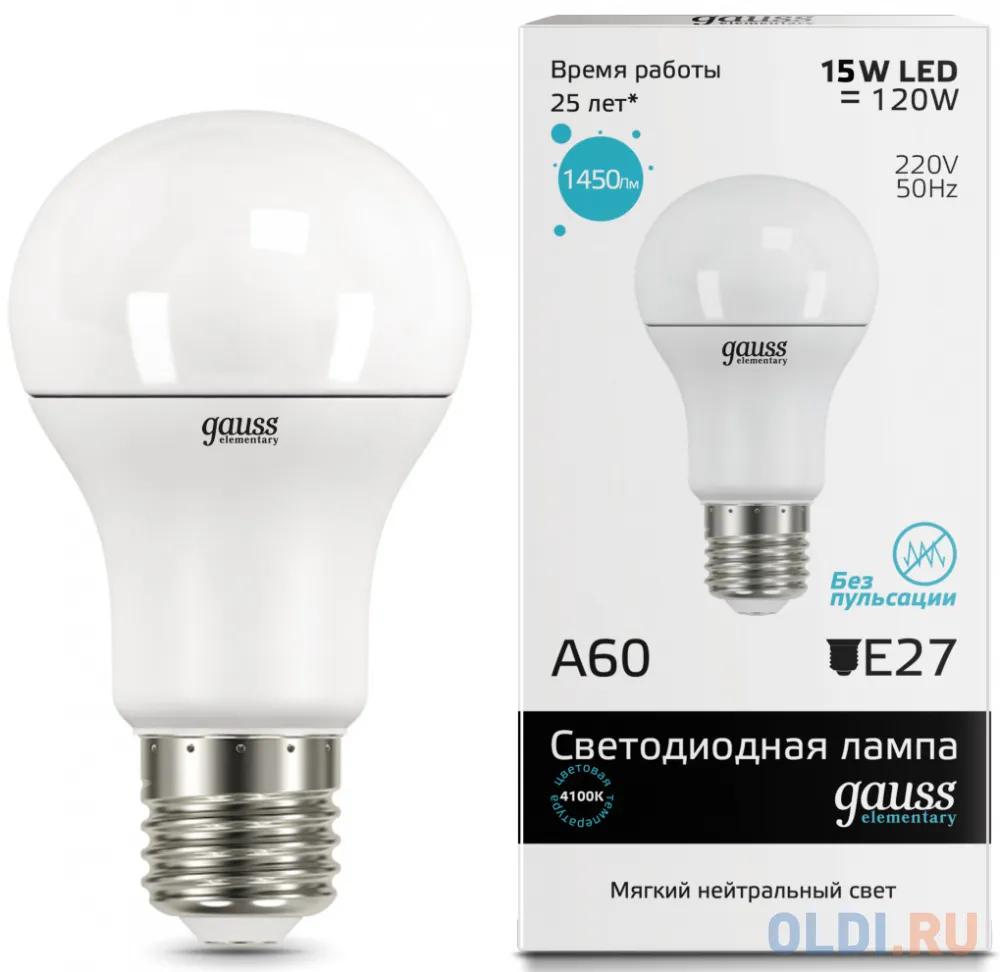 5Лампа Gauss LED Elementary A60 15W E27 4100K 23225