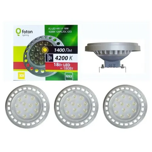 "Лампа Светодиодная Софит AR111 18W 12V G53 1400Лм 4200К Угол 30 град. D-111mm L-55mm Свет Нейтральный белый Foton Lighting, уп. 3шт" относится к дешёвому сегменту . Цена, предложенная магазином Яндекс.Маркет , на 0% отличается от популярной цены (4050 руб.).
