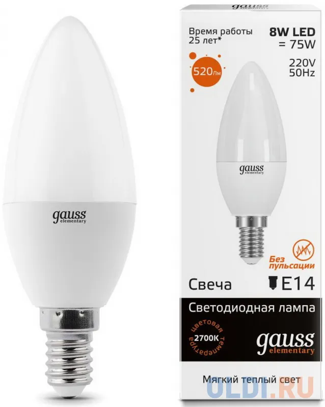 Лампа GAUSS 34118 led elementary candle tailed 8w e14 2700k 1/10/50