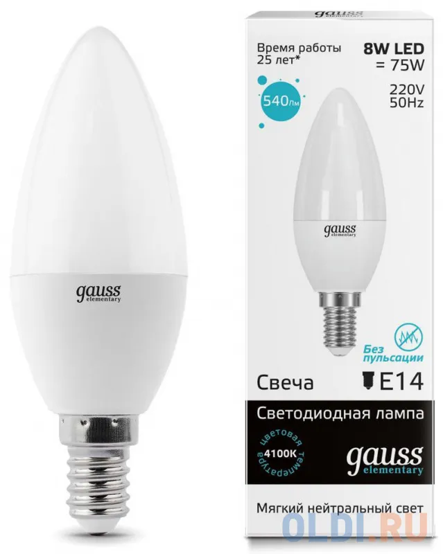 Лампа GAUSS LED Elementary 33128 candle 8w Е14 4100k 1/10/100