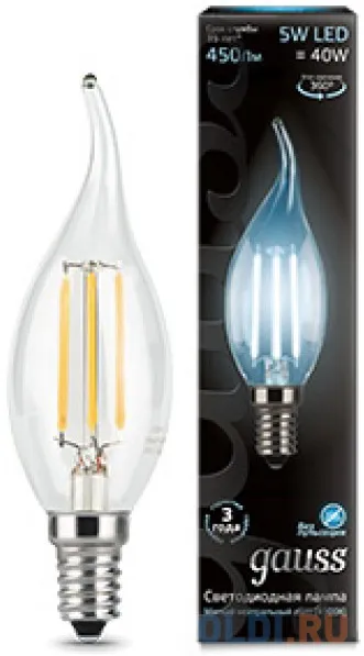 Лампа светодиодная филаментная Gauss Е14 4100К 5 Вт 450 Лм 175-240 В свеча на ветру прозрачная
