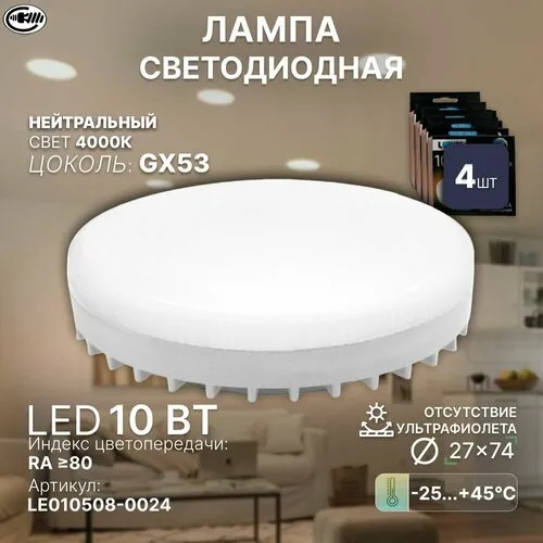 Лампочка GX53L, Нейтральный белый свет, GX53, 10 Вт, Светодиодная, 4 шт. Лампа с/д LEEK LE SPT 10W 4K GX53 (JB) (100)