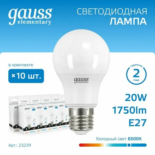 Лампочка светодиодная E27 Груша 20W холодный свет 6500K упаковка 10 шт. Gauss Elementary