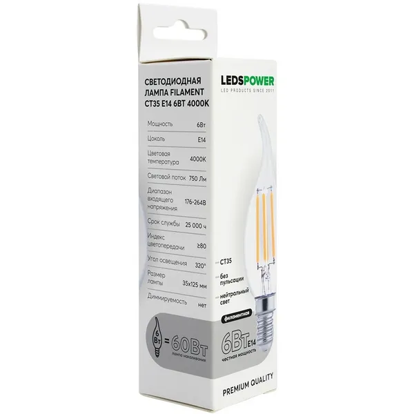 Лампочка светодиодная филаментная E14 6Вт 4000K LEDS POWER 007106 LEDS Power