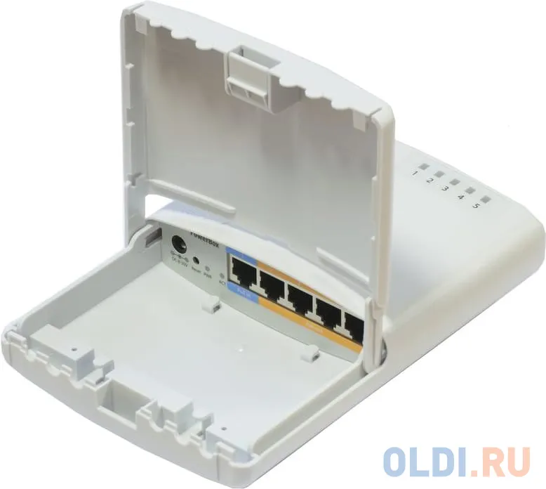 Маршрутизатор MikroTik RB750P-PBr2 PowerBOX with 650MHz CPU, 64MB RAM, 5xLAN (four with PoE out), RouterOS L4, outdoor case, PSU, PoE, mounting set