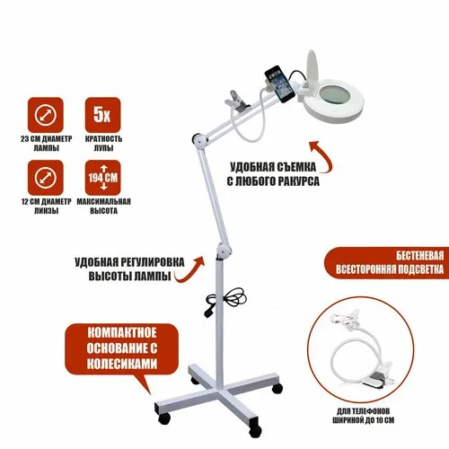 Напольная лампа лупа LCD-1 косметологическая светодиодная на колесах с гибким держателем-прищепка для телефона