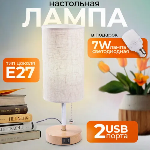 Настольная лампа с выключателем, с абажуром White, цоколь E27, лампа в подарок, с зарядными портами USB