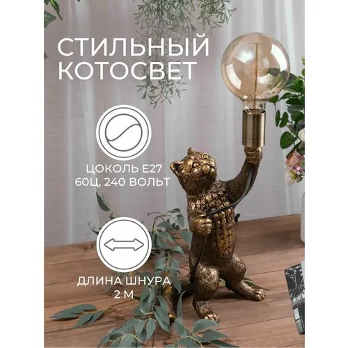 Настольная лампа светильник из мрамора Bogacho Кот Мэдисон 60 см бронзового цвета с золотой поталью - лампа в комплекте