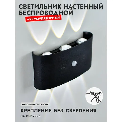 Светильник настенный беспроводной аккумуляторный черный с датчиком движения 6 ватт ламп холодный свет 6000К