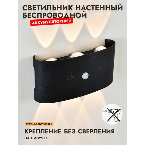 Светильник настенный беспроводной аккумуляторный черный с датчиком движения 6 ватт ламп теплый свет 3000К