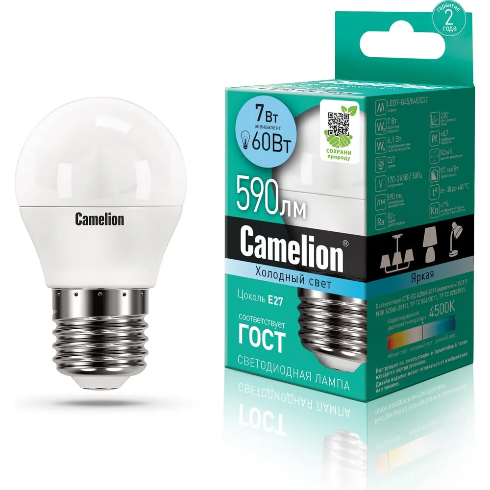 Цены на похожие товары Camelion, e27, 4500 K, 560 Лм, 77 Ra, 7 Вт, G, шар, 220 В
