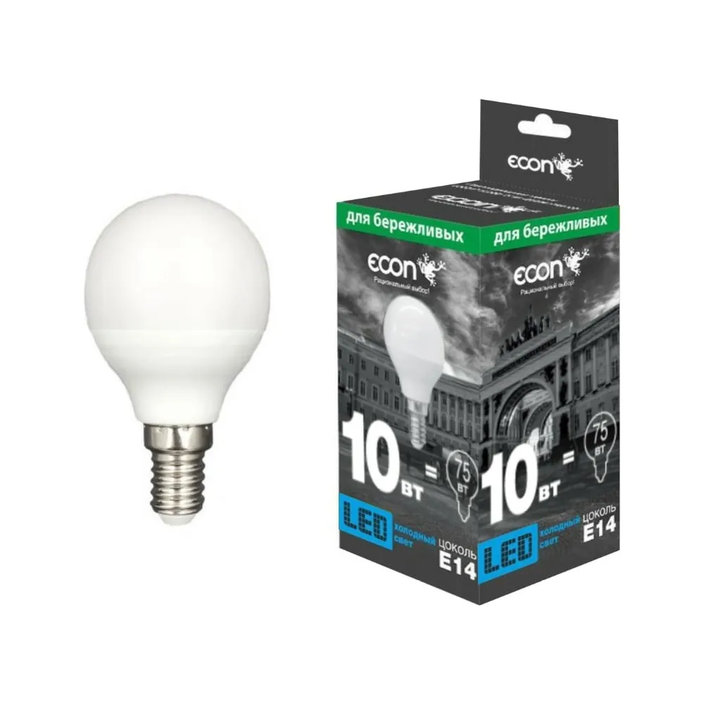 Цены на похожие товары Econ, 6500 K, 950 Лм, 80 Ra, 10 Вт, e14, Р45, 220 В, шар
