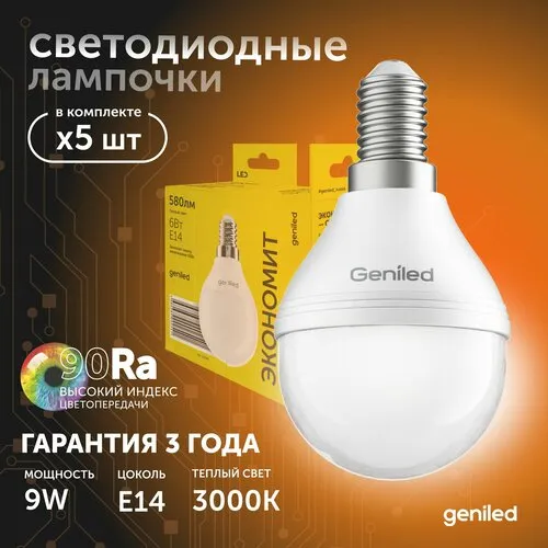 3Светодиодная лампа Энергосберегающая Geniled E14 G45 9Вт 3000K 90Ra Шар 10 шт