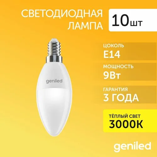 Светодиодная лампа Энергосберегающая Geniled E14 C37 9Вт 4000K 90Ra Свеча 10 шт