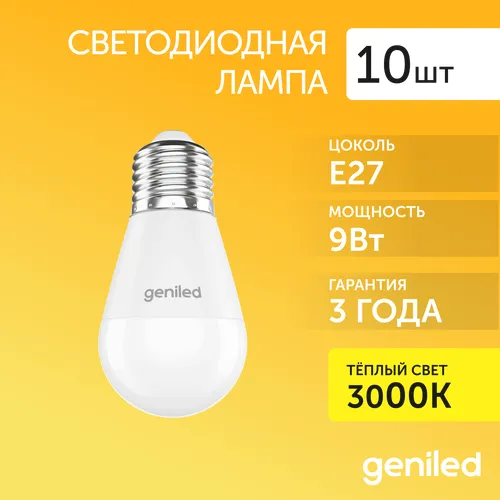 Светодиодная лампа Энергосберегающая Geniled E27 G45 9Вт 3000K 90Ra Шар 10 шт