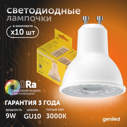 Светодиодная лампа Энергосберегающая Geniled GU10 MR16 9Вт 3000K 90Ra линза Софит 10 шт