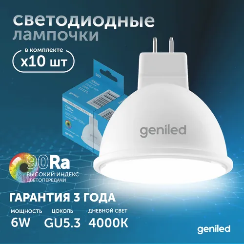 Светодиодная лампа Энергосберегающая Geniled GU5.3 MR16 6Вт 4000K 90Ra Софит 10 шт