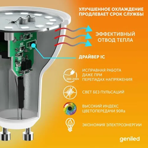 4Светодиодная лампа Энергосберегающая Geniled GU10 MR16 9Вт 3000K 90Ra Софит 10 шт