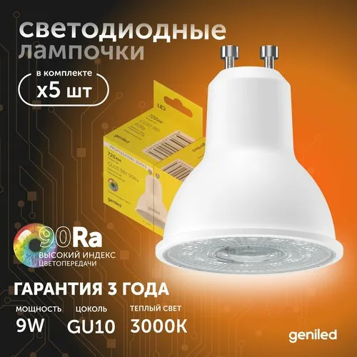 4Светодиодная лампа Энергосберегающая Geniled GU10 MR16 9Вт 3000K 90Ra Софит 10 шт