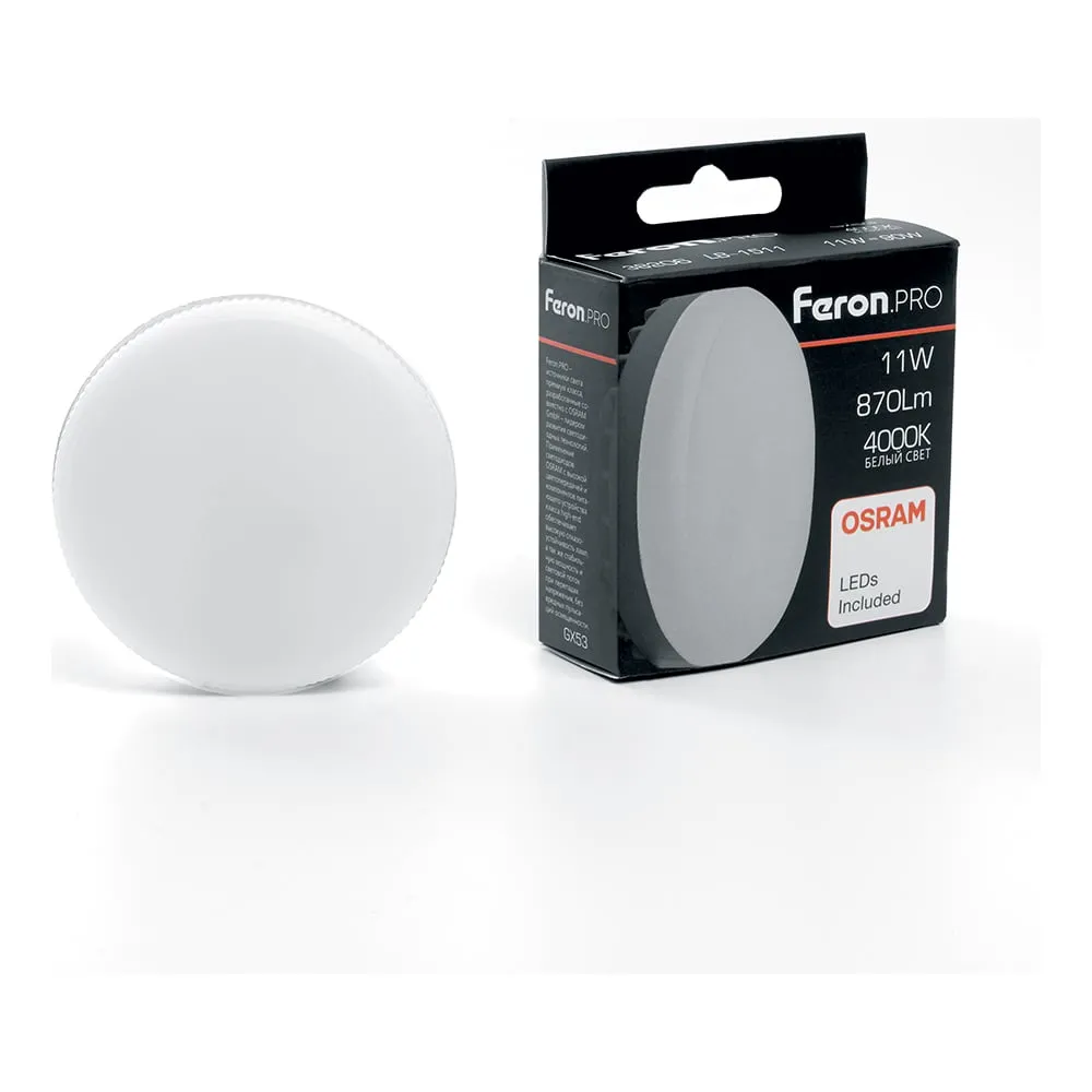 Цены на похожие товары Feron, 4000 K, 870 Лм, 80 Ra, 11 Вт, 220 В, gx53, таблетка, GX
