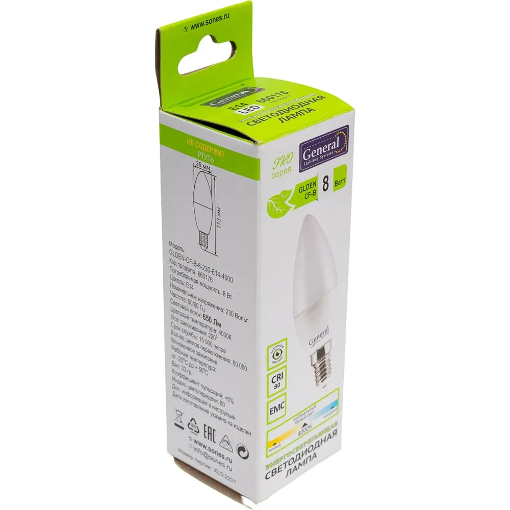 Цены на похожие товары General lighting systems, 4000 K, 650 Лм, 80 Ra, 8 Вт, C, 220 В, e14, свеча