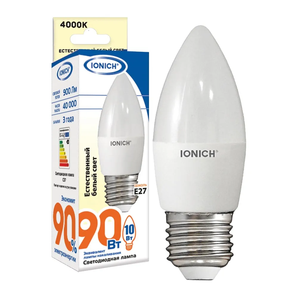 Цены на похожие товары Ionich, 2700 K, 900 Лм, 80 Ra, 10 Вт, свеча, 220 В, c37, e27