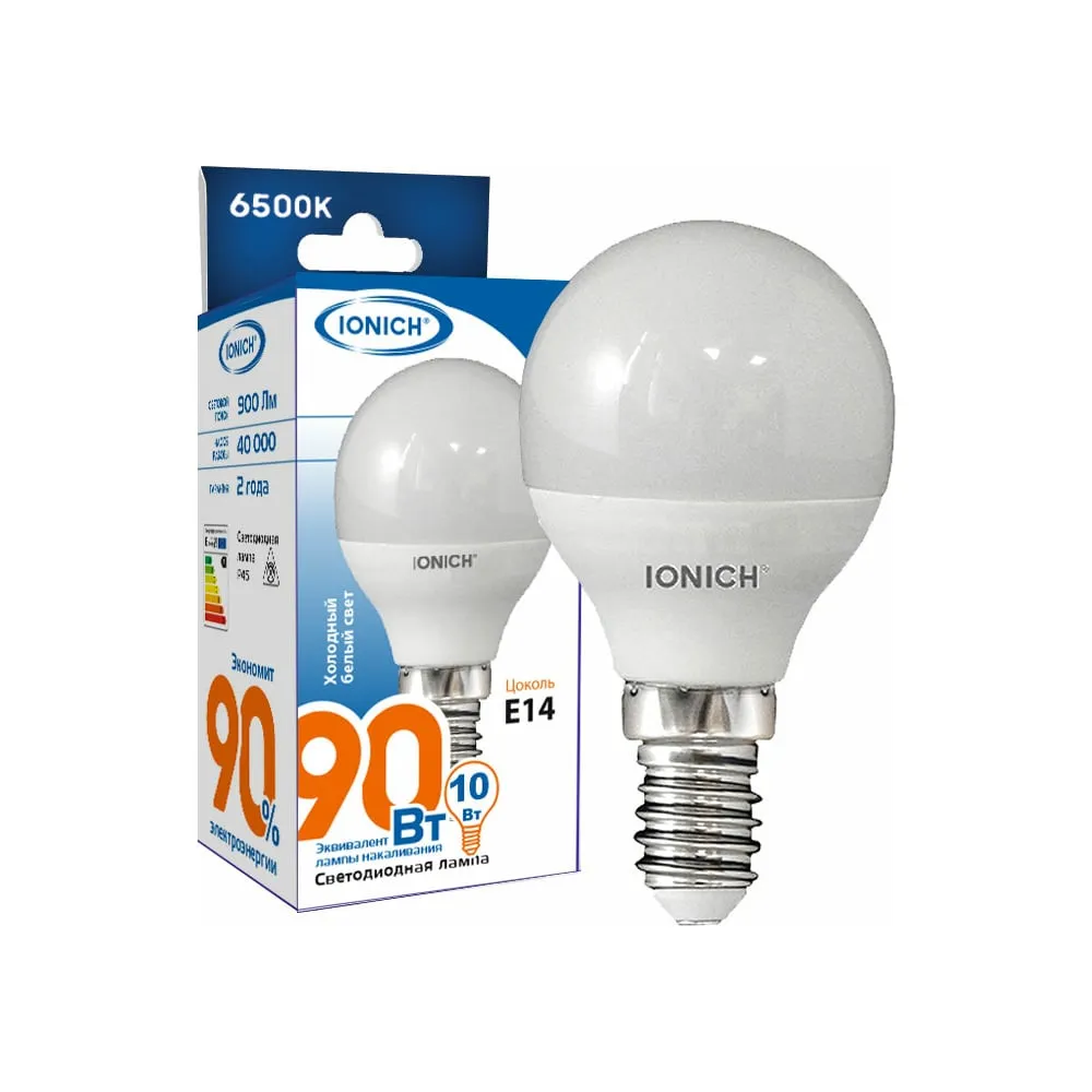 Цены на похожие товары Ionich, 6500 K, 900 Лм, 80 Ra, 10 Вт, шар, e14, 220 В, Р45